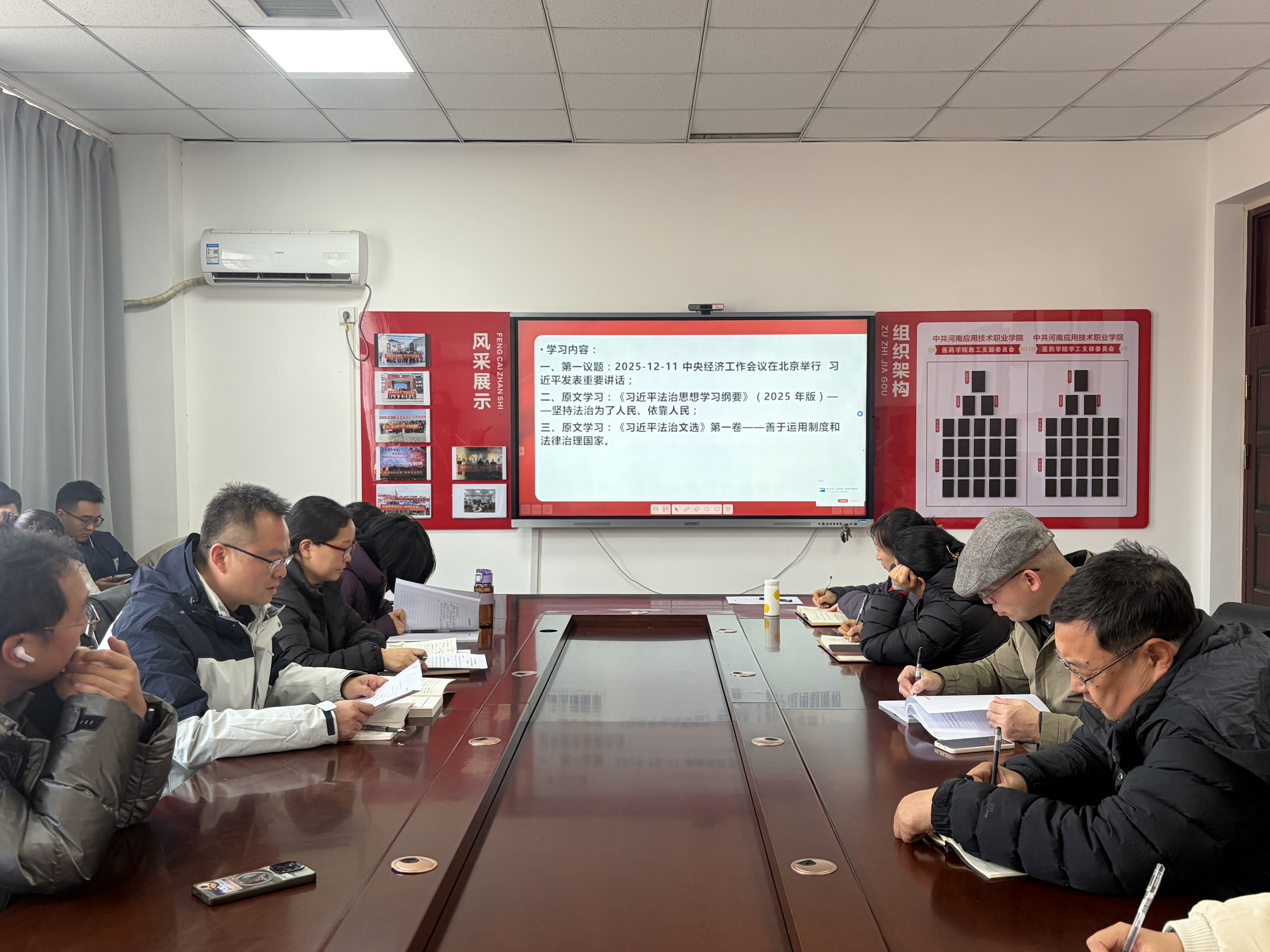 会上,张亮带领全体教师深入学习第一议题:“中央经济工作会议在北京举行 习近平发表重要讲话”,随后领学《习近平法治思想学习纲要》--坚持法治为了人民、依靠人民;学院副经理唐贝领学《习近平法治文选》第一卷--善于运用制度和法律治理国家。